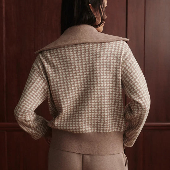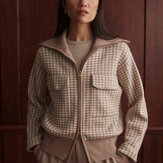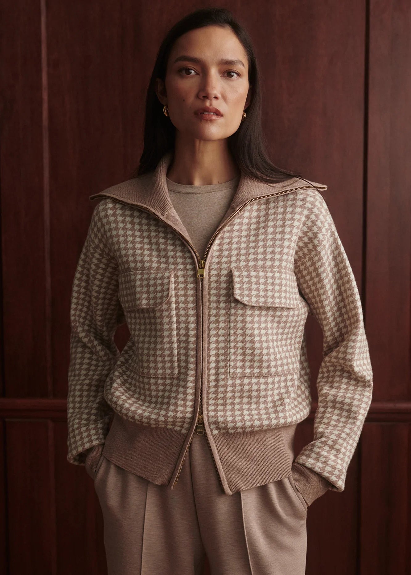 The Ablett Jacquard Knit Jacket elevates everyday layering with a sophisticated houndstooth jacquard weave throughout. Designed for versatility, it features a refined turn-back collar, generous patch pockets for practical storage, and a two-way zip that adapts to your styling needs. The structured knit construction makes it an ideal mid-layer for transitional seasons, while the classic pattern ensures lasting appeal across multiple outfits.