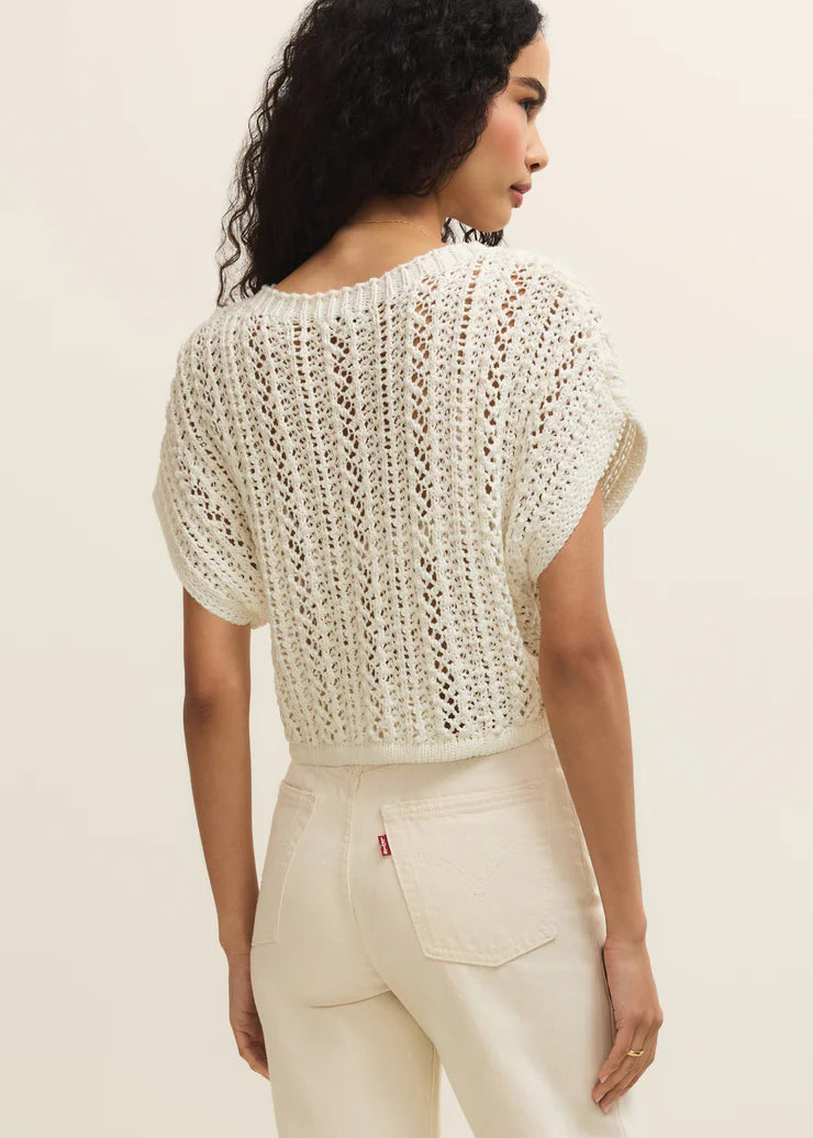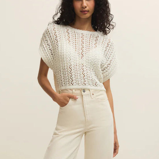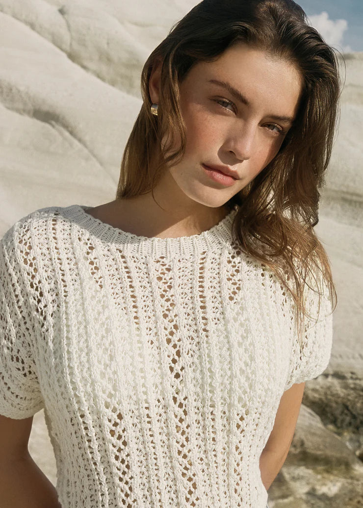 A rope yarn blend brings soft texture to this pretty lightweight top. With its all-over crochet detail, this crewneck is the perfect blend of effortless and cool. Pairs well with high waist bottoms both denim or linen.