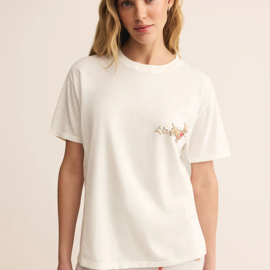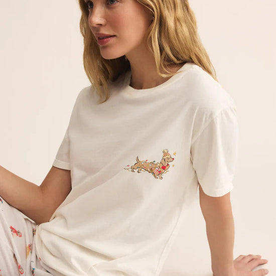 Crafted from our signature loose-knit cotton jersey, the Bestie Boyfriend Tee delivers effortless style with its relaxed, borrowed-from-him silhouette and graceful drape. A festive screen print adorned with gold foil detailing adds playful personality to this wardrobe staple. The heavy soft wash enhances comfort, while the crew neck and short sleeves keep the look casual and versatile. Perfect for layering or wearing solo, this 100% cotton essential pairs seamlessly with your everyday rotation. Machine wash cold on gentle cycle; tumble dry low or lay flat to dry.