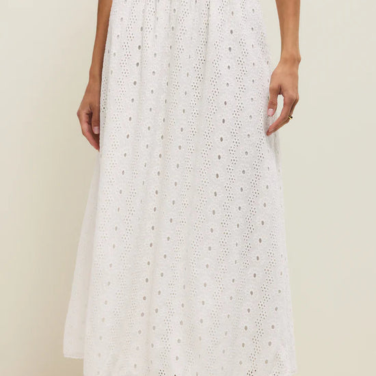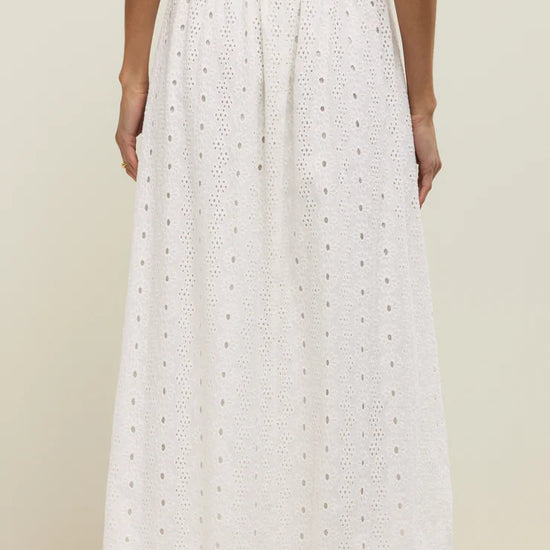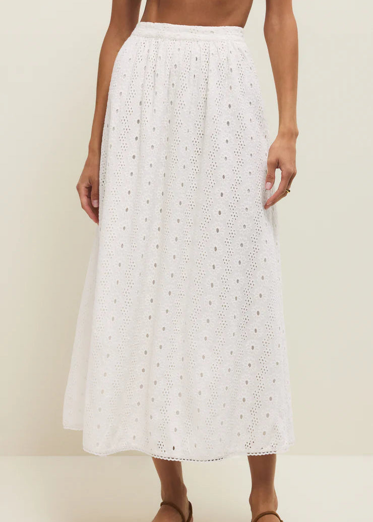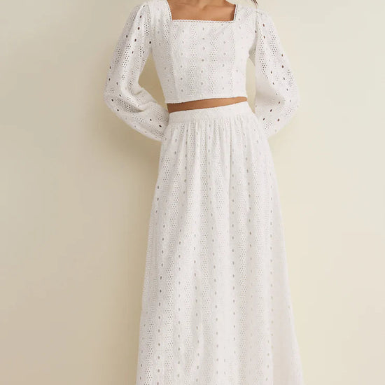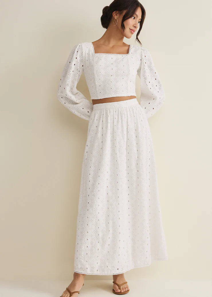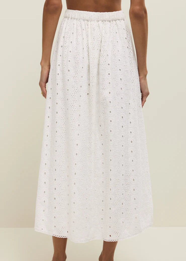 The perfect skirt does exist. Crafted from 100% cotton with delicate eyelet detailing, this high-rise midi skirt combines timeless elegance with everyday comfort. The elastic waistband ensures a secure, flattering fit, while full lining provides coverage and durability. Its mid weight fabric features a heavy soft wash for a lived-in feel that only improves with wear. Hand wash cold separately and hang to dry, or dry clean for best results.