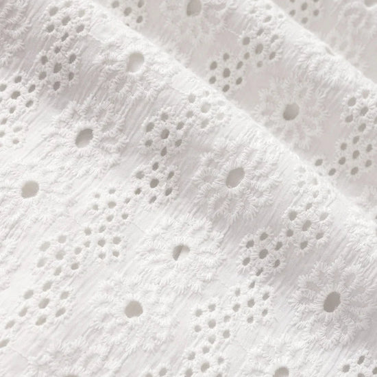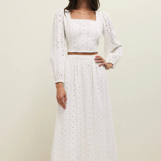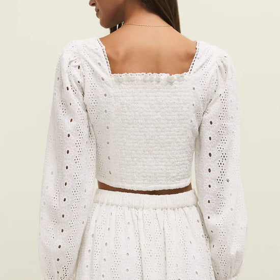Crafted from 100% cotton eyelet, the Bria Top delivers effortless elegance with its square neckline, voluminous sleeves, and smocked back detail. The cropped silhouette pairs beautifully with high-rise bottoms, while the lightweight, soft-washed fabric ensures comfort throughout the season. A versatile piece that balances romantic styling with everyday wearability.