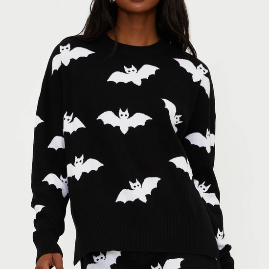 The Callie Sweater blends cozy cotton knit fabric with a playful bat print for stylish comfort. Its crew neckline, ribbed cuffs, and hem provide a snug fit, while the relaxed, slightly oversized silhouette ensures easy layering and all-day ease. Perfect for adding a touch of fun to your casual wardrobe.