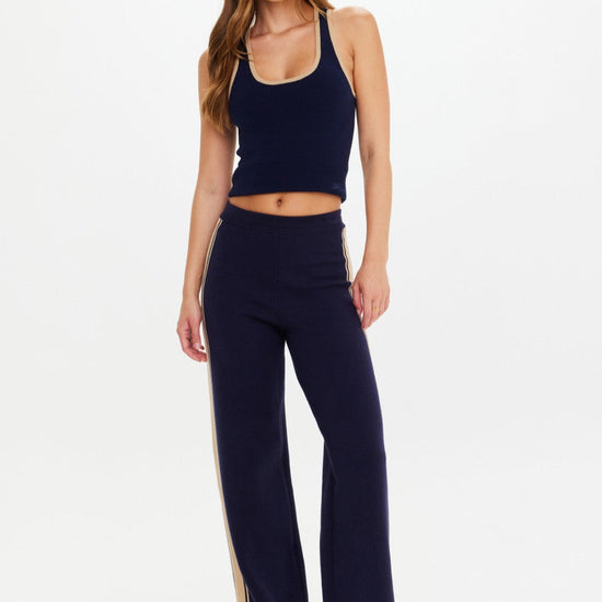 The Cosmo Freya Knit Pant combines effortless style with premium comfort, crafted from organic cotton knit in a refined straight-leg silhouette. Featuring elasticated waistband and subtle side stripes, these navy pants offer a tailored fit enhanced by short hem splits and a discreet embroidered arrow logo at the back. Ideal for versatile wear, they provide a polished yet relaxed look suitable for both casual and elevated occasions.