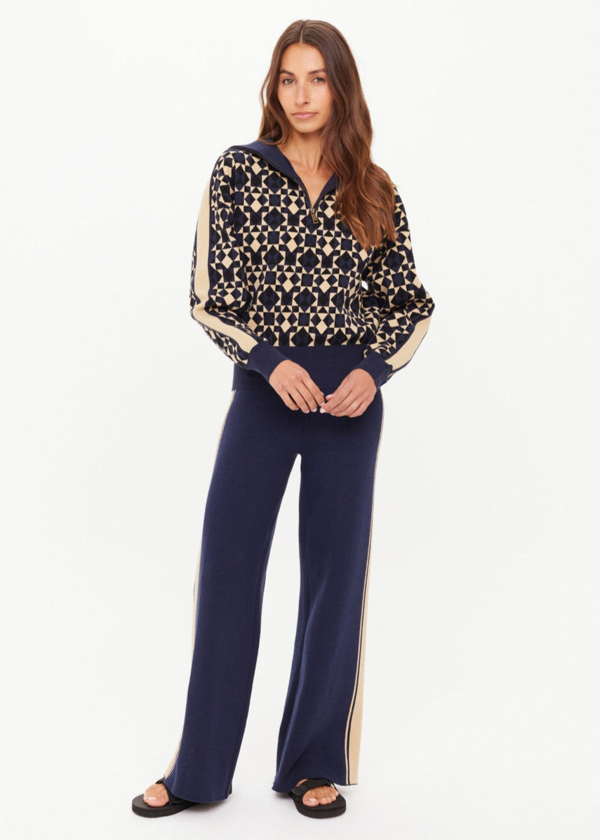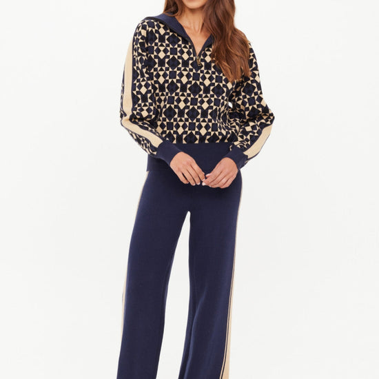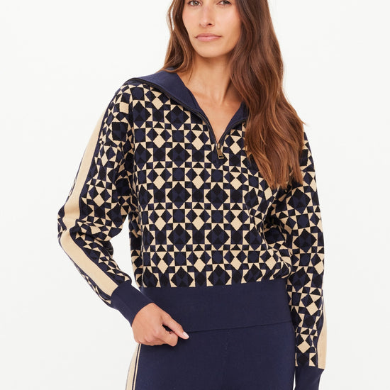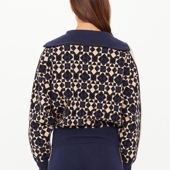 The Cosmo Kairo Half Zip combines style and comfort with its organic cotton knit jacquard fabric featuring a distinctive cosmo geometric print. Designed for everyday wear, this jumper includes beige knitted stripes along the sleeves, a ribbed hem, cuffs, and an oversized collar for a refined fit. The half-zip design adds versatility, while the embroidered arrow detail on the sleeve offers a subtle accent. Ideal for casual occasions, this piece balances unique design with quality craftsmanship for lasting comfort and style.