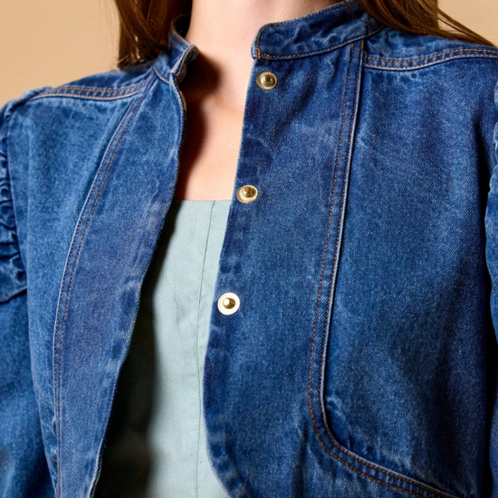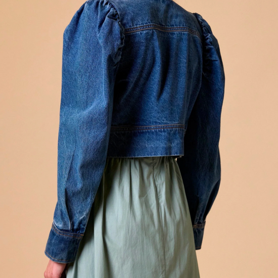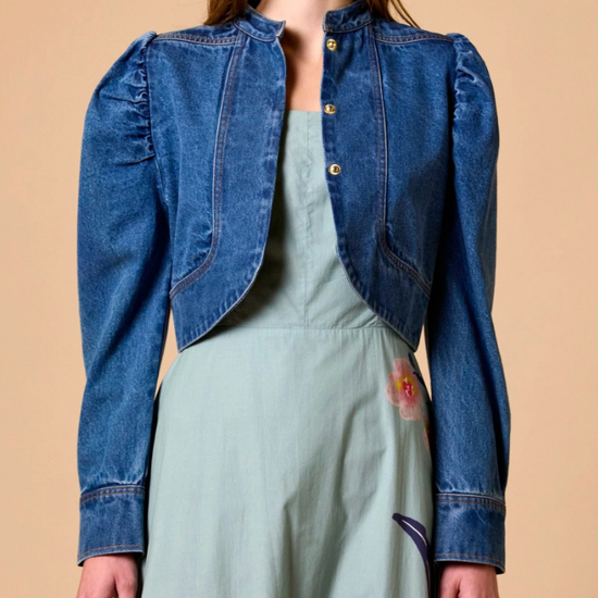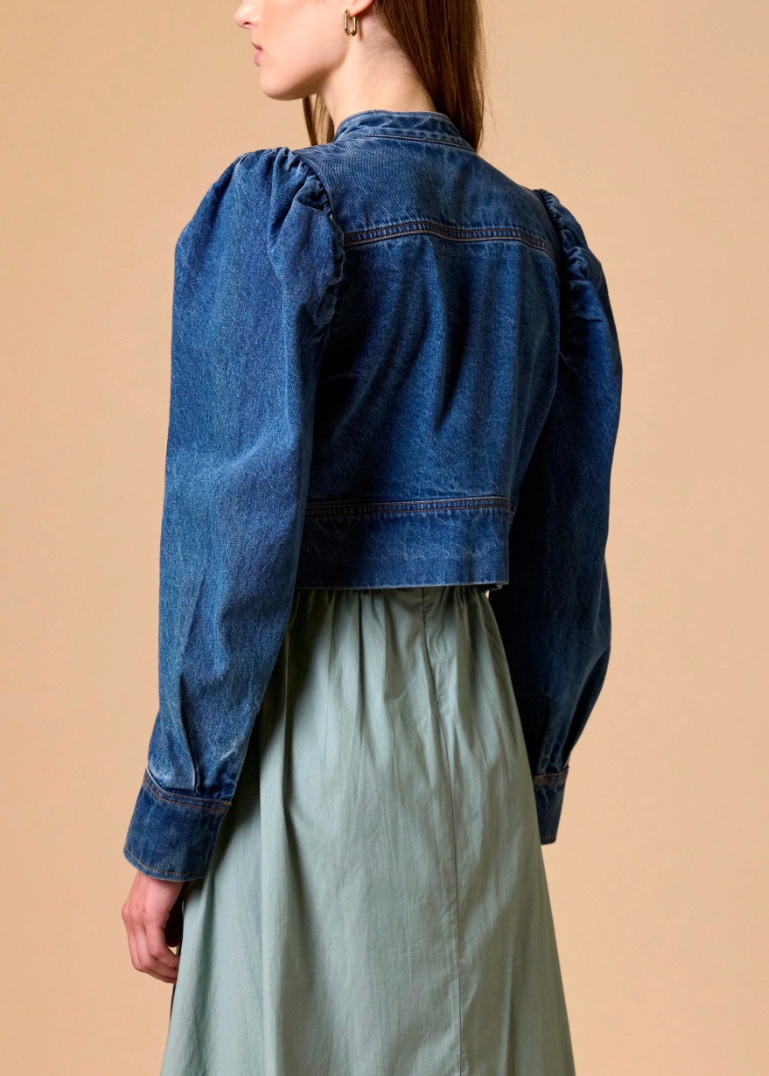 Crafted from 100% cotton, the Damien Denim Jacket is defined by its cropped silhouette, romantic long puff sleeves, and a refined mock neckline make this an elevated take on timeless denim.