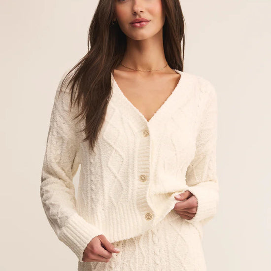 Crafted from sumptuous marshmallow yarn, the Elsa Cable Cardigan delivers effortless layering with its relaxed silhouette and textured cable knit. The lightweight 100% polyester construction provides cloud-like softness without bulk, while the V-neck and long sleeves offer versatile styling options. A button front closure makes it easy to adjust warmth on the fly. The heavy soft wash finish enhances its plush feel, making this piece equally at home layered over basics or paired with matching bottoms for a coordinated winter look.