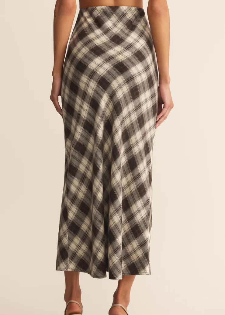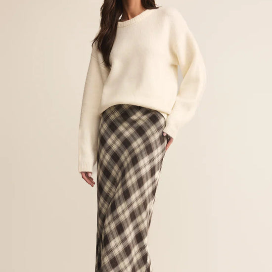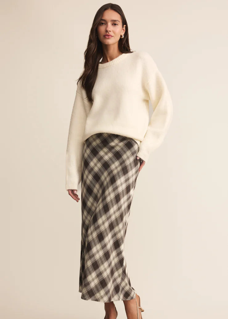 Crafted from a luxurious rayon-polyester blend, this plaid midi skirt delivers effortless sophistication for transitional dressing. The high-rise elastic waistband provides comfortable all-day wear, while the heavyweight soft wash enhances the fabric's natural drape and texture. Its timeless plaid pattern and midi silhouette make it an essential layering piece that transitions seamlessly from season to season. Perfect for building versatile, polished outfits with minimal effort.