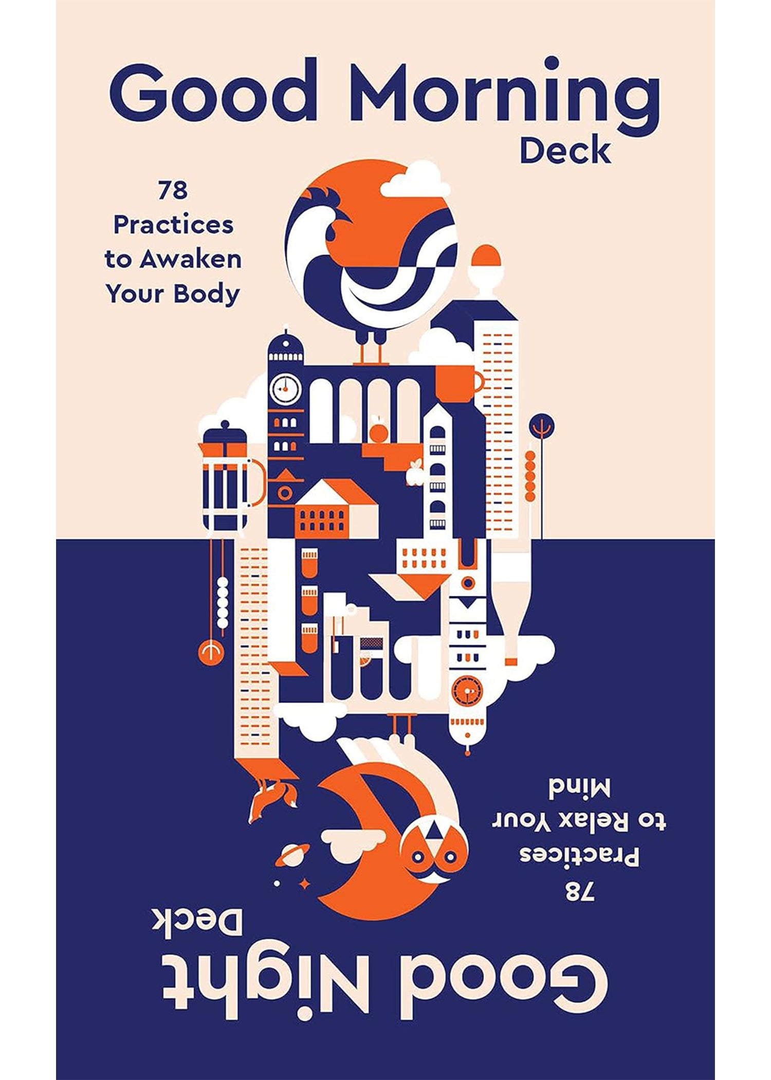 Good Morning, Good Night Deck offers ways to both start and end your day right. Each card has two prompts: Turn to the morning side for ways to awaken your body, from energizing yoga stretches to inspiring meditations; flip to the night side to unwind from your day with calming reflections and encouraging mantras. Each card's prompts can be used in tandem for a full-day practice or drawn at random when you need a little boost to your morning or night. Reflecting the moods of each side of the card, this vibrant deck uses a hue of yellow for the morning side and a hue of blue for the night side, creating a vibrant deck to help inspire your day.