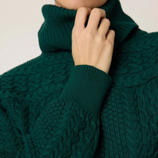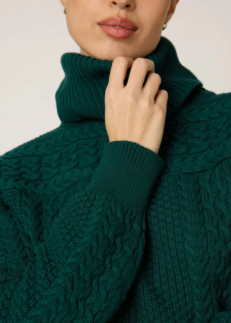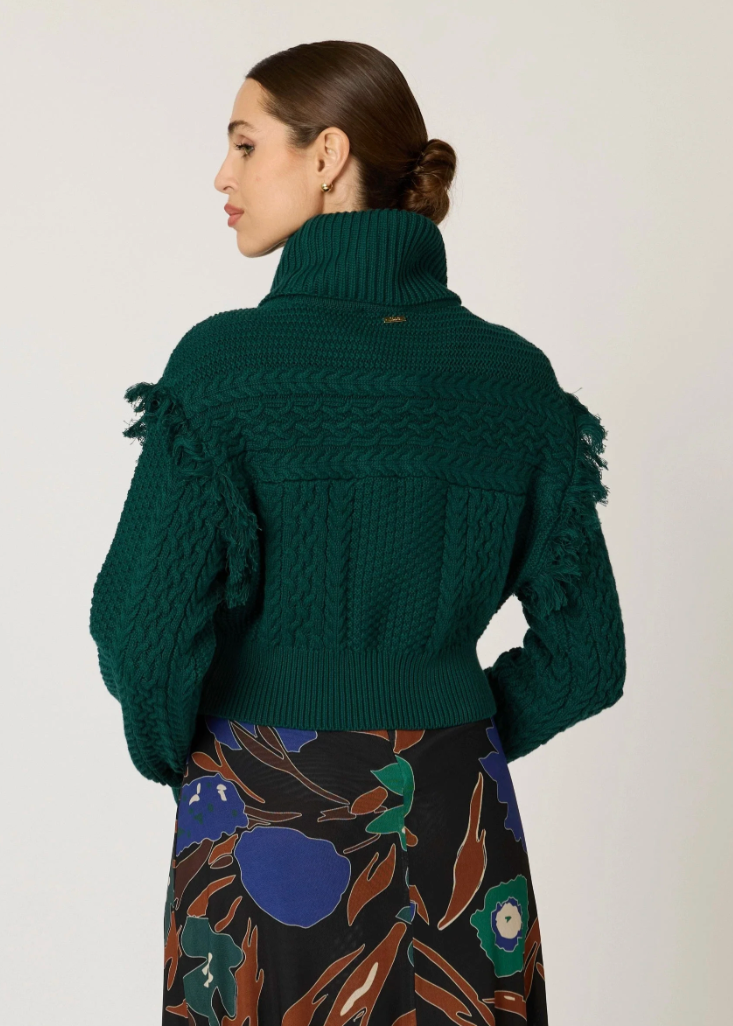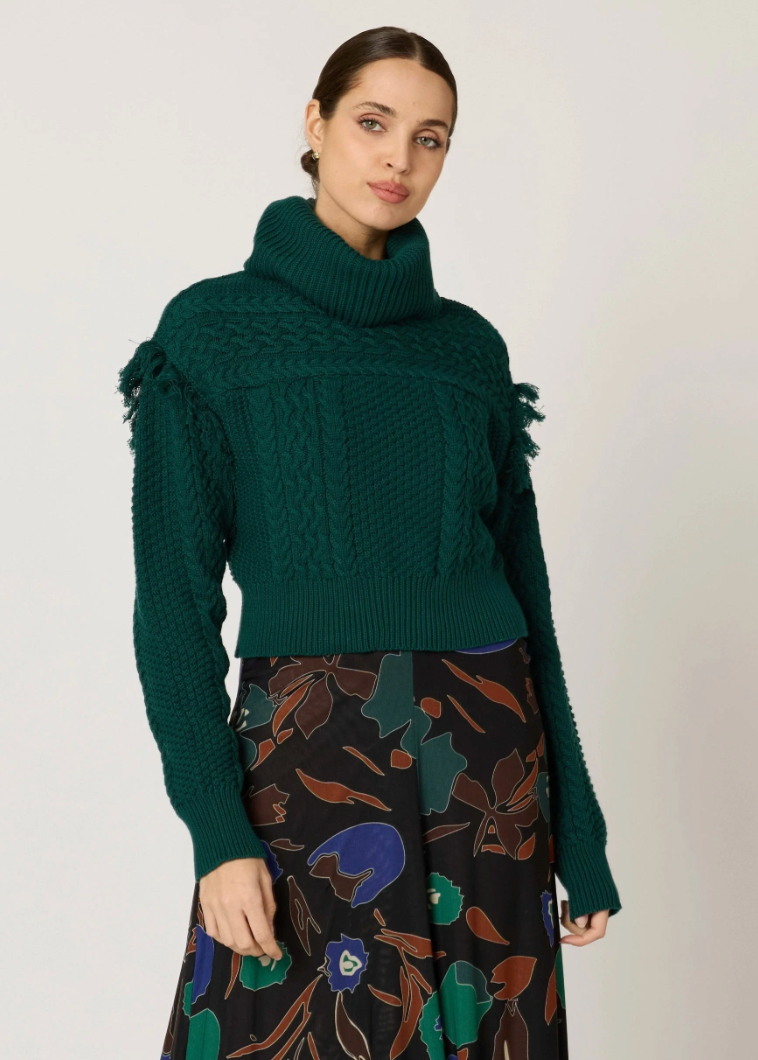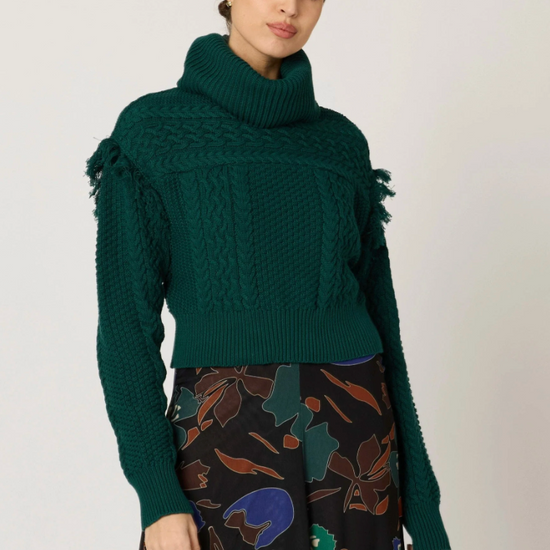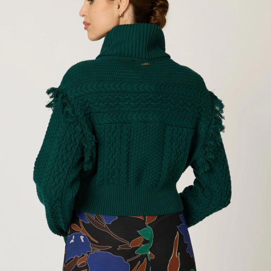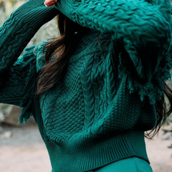 Crafted from 100% organic cotton, the Haven Sweater delivers sustainable luxury with a refined aesthetic. Its high neckline and long sleeves provide understated elegance, while signature fringe detailing at the cuffs adds subtle texture and movement. The slip-on silhouette ensures effortless dressing, making it equally at home layered over basics or worn as a standalone statement piece. Timeless in design yet contemporary in execution, this versatile knit bridges casual comfort and polished sophistication.