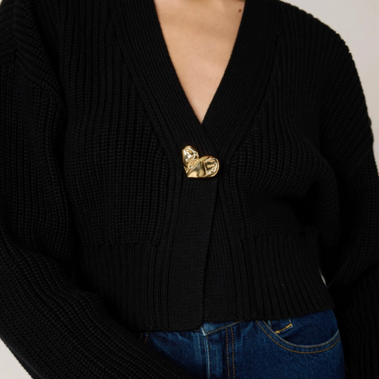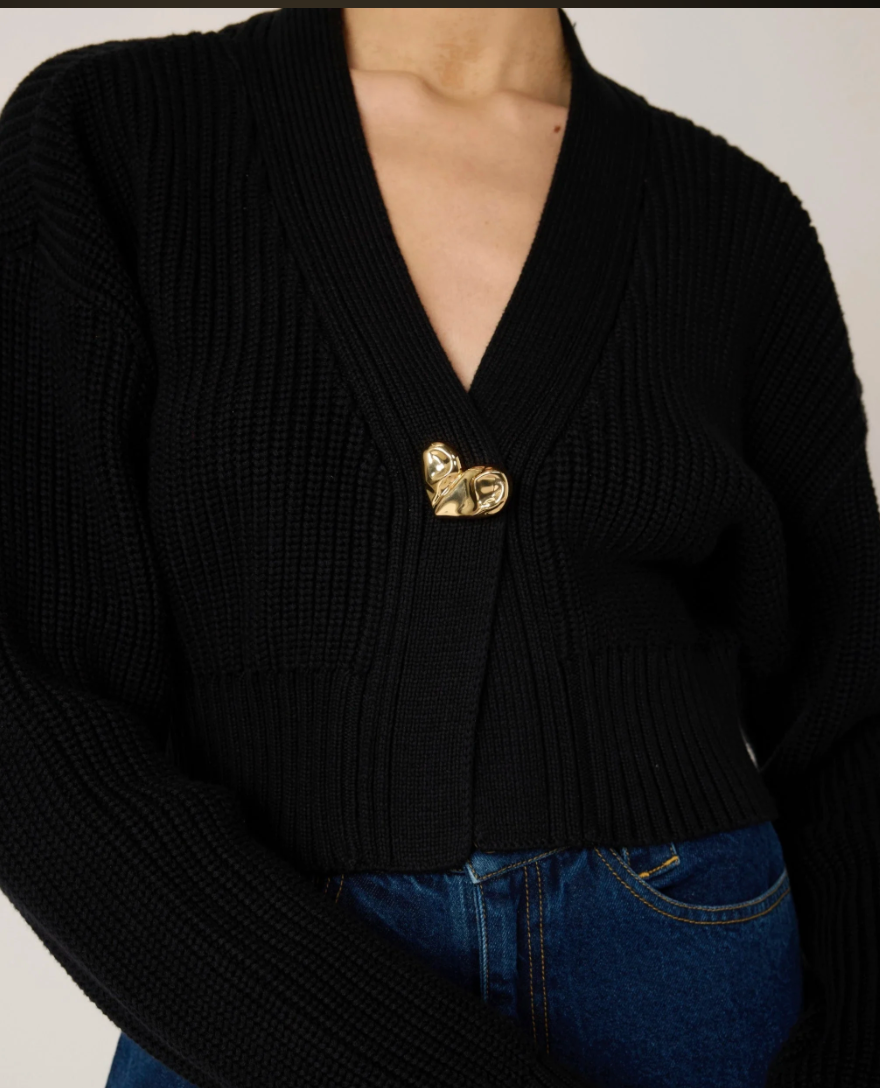 Crafted from soft organic cotton yarn, this Heart Sweater Cardigan combines thoughtful design with sustainable materials. Heart-shaped button closures serve as functional statement details, while the cropped silhouette flatters various body types. Ribbed knit at the neckline, hem, and cuffs ensures a structured, refined finish that resists stretching. The imperfect heart charm adds distinctive character—no two pieces are identical. Layer effortlessly over dresses, under jackets, or pair with denim and skirts for versatile styling across seasons.
