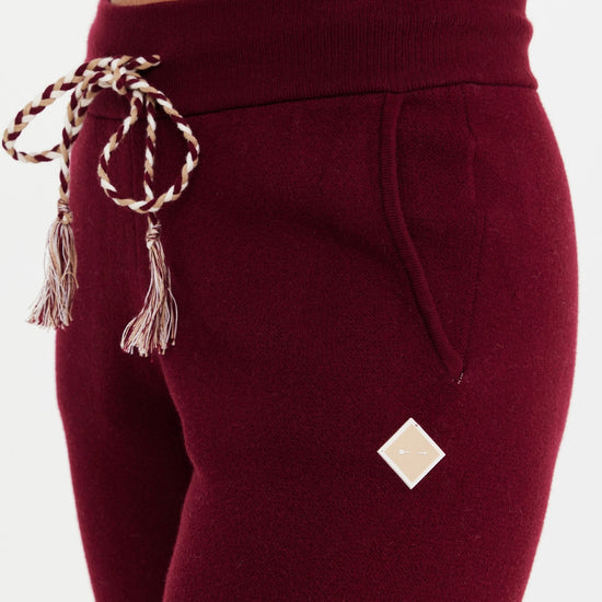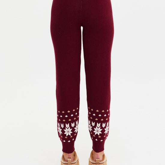 The Le Ski JoJo Knit Jogger delivers effortless comfort for relaxed moments at home or casual outings. Crafted from a soft organic cotton knit blend in rich quince red, these joggers feature practical side seam pockets, ribbed ankle cuffs, and a knitted snowflake design that adds subtle seasonal charm. The soft knitted waistband includes a braided tassel drawcord for adjustable fit, while the signature rubber arrow logo patch completes the refined aesthetic. Perfect for an off-duty look by the fire.