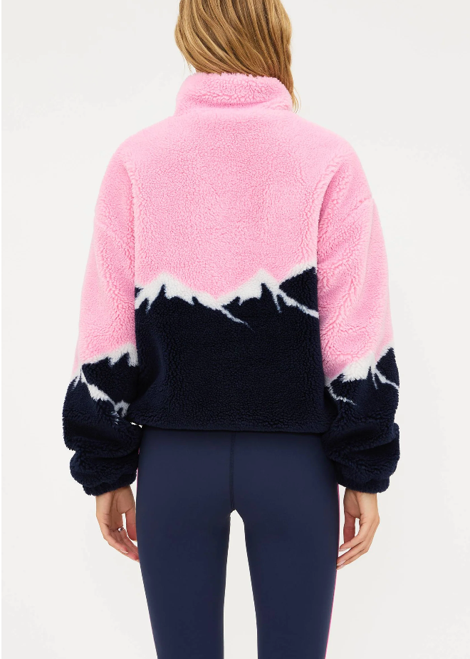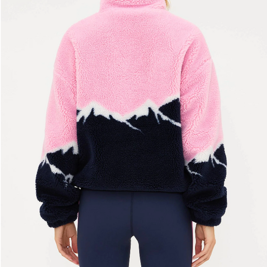 Wrap yourself in the Leona Sherpa Top, engineered for maximum warmth without bulk. This pullover features a soft, cozy sherpa fabric paired with a half-zip front and high collar that lets you dial in your comfort level. The striking colorblock mountain peak design in pink, navy, and white makes a bold statement, while functional front pockets and an adjustable drawcord hem give you styling flexibility—cinch it for a cropped silhouette or wear it relaxed. Finished with elastic cuffs to seal in warmth, this is the layering piece that works as hard as you do.