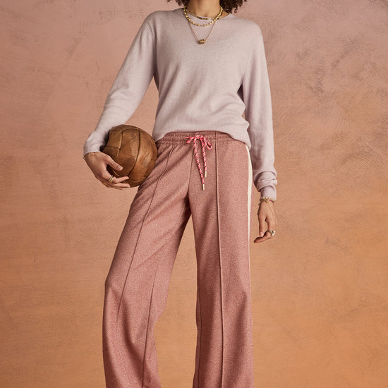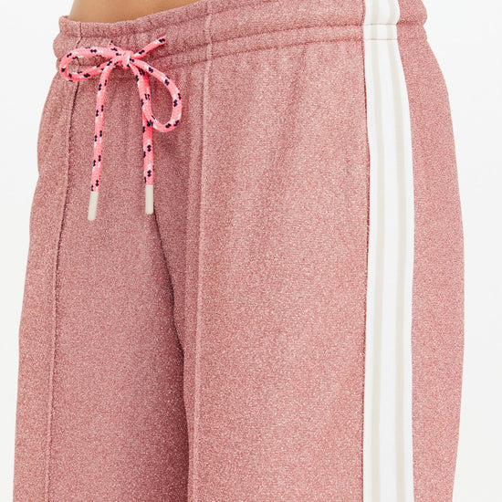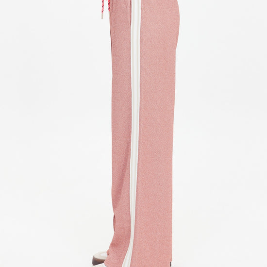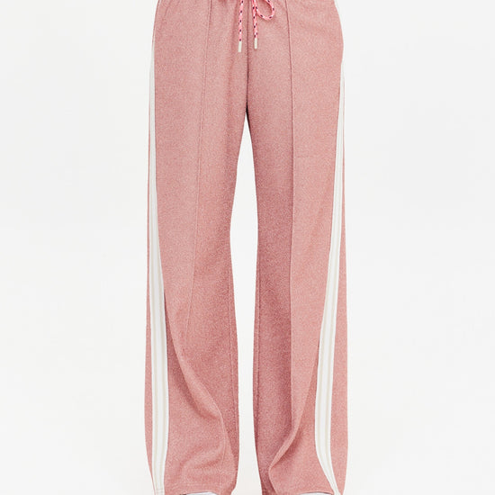 Step out in style with the Loretta Pant, featuring a retro sport vibe and a dazzling pink quartz lurex sparkle fabric. These mid to low rise straight-leg pants offer comfort with an elasticated waistband and neon pink drawcord, while pin tucks and stripe knitted tape add sporty flair. Practical side seam pockets and an embroidered arrow logo complete the playful look. Perfect for adding a pop of sparkle to your everyday wardrobe!