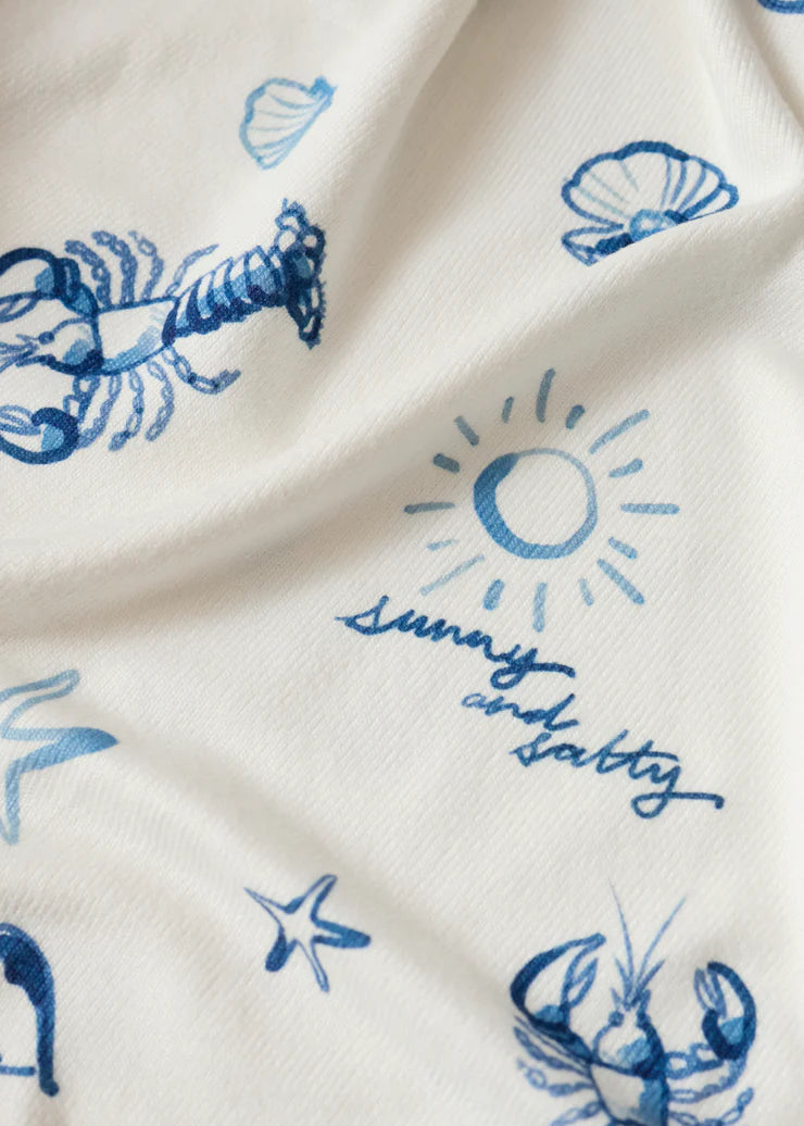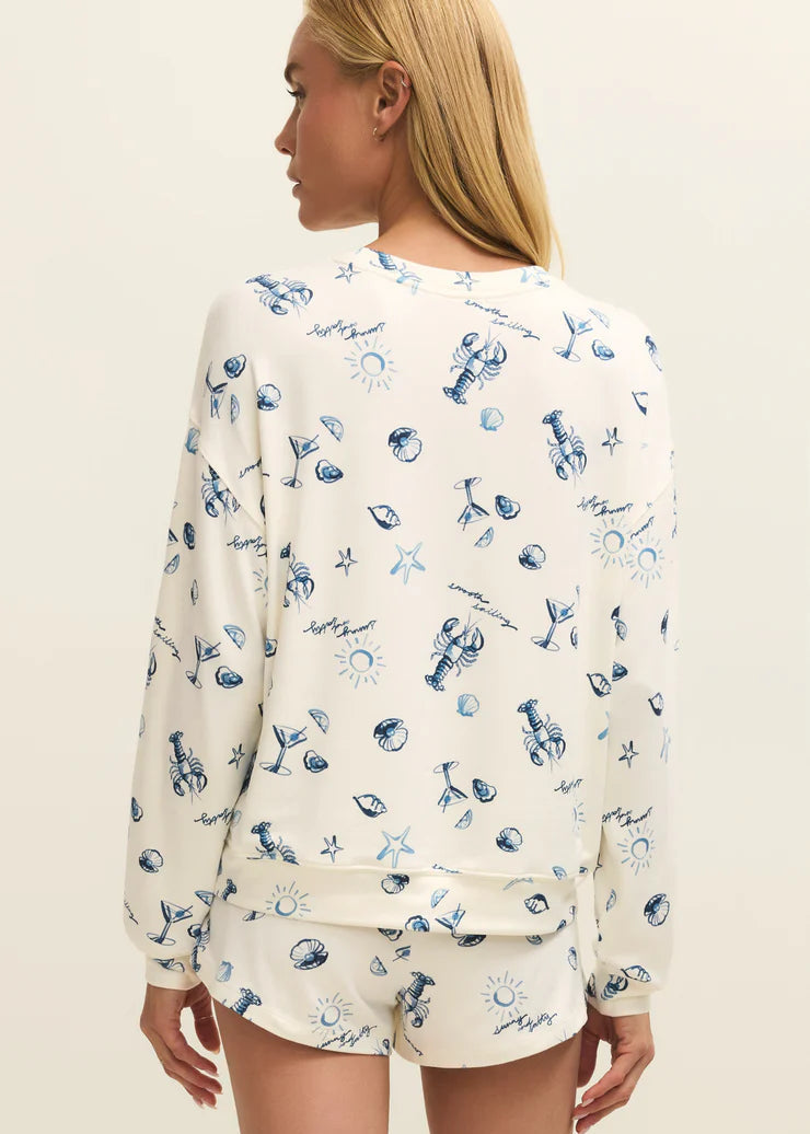 A signature silky jersey gives this long sleeve crewneck its soft and cozy feel. The relaxed fit makes it perfect for lounging at home or even on vacation with its seaside inspired print. Pair with its matching bottom to complete the look.