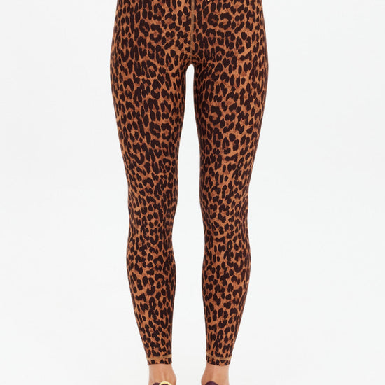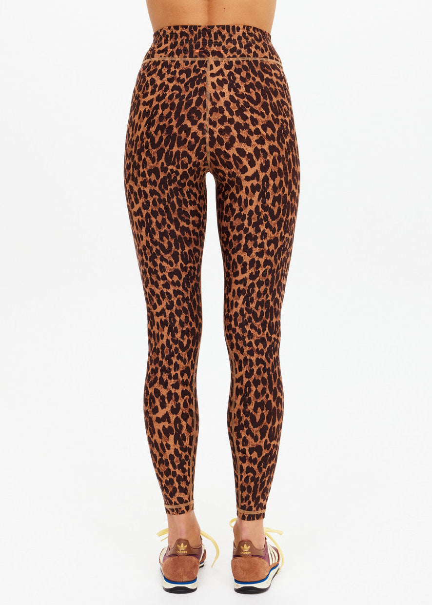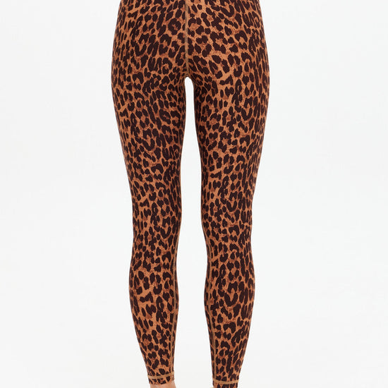 Elevate your practice with these versatile midi pants, crafted from recycled soft peached fabric that breathes, wicks moisture, and dries quickly. The mid-rise 25" length offers comfortable coverage, while the striking Malawi leopard print commands attention. Finished with an orange and navy striped drawcord and a contrasting orange arrow logo at the back, these pants blend performance with bold style—perfect for yoga, studio sessions, or everyday wear.