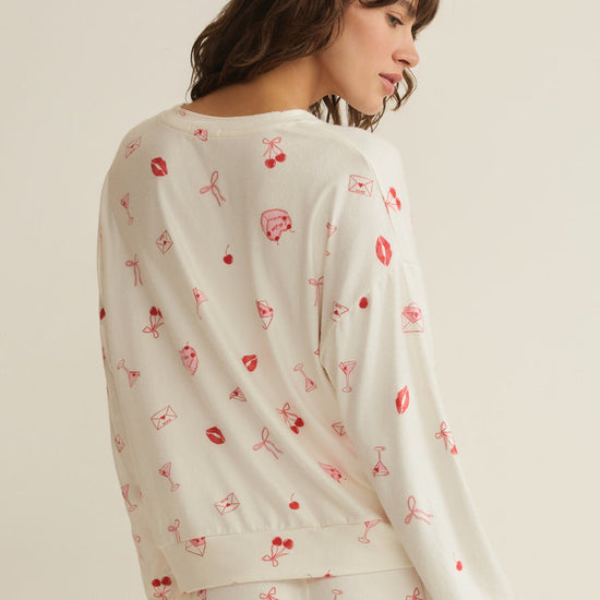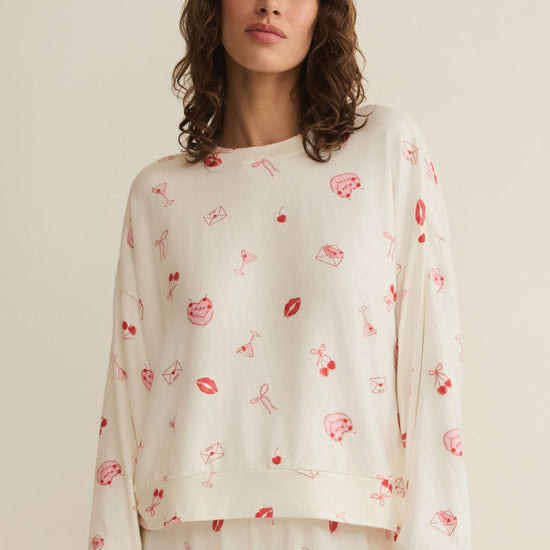 Elevate your loungewear collection with the Mira Sweet Things Long Sleeve Top, crafted from luxuriously soft Silky Jersey that feels as good as it looks. Featuring an allover sweet print and a fitted silhouette with a relaxed drape, this lightweight essential transitions seamlessly from solo wear to layering piece. The crew neckline and long sleeves provide understated elegance, while the heavy soft wash ensures lasting comfort. Pair it with matching lounge bottoms to create a cohesive set, or style it over your favorite basics for effortless sophistication. Machine wash cold on a gentle cycle; tumble dry low or lay flat to dry.
