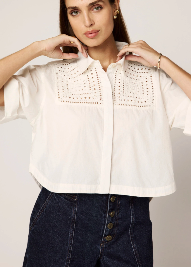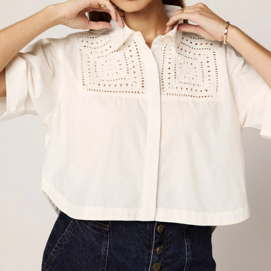 The Montana Blouse brings a playful twist to your warm-weather wardrobe. Handmade in India from 100% organic cotton poplin, this cropped, short-sleeve button-down features a classic collar and charming crochet details on the front yoke. Its lightweight, relaxed fit keeps you cool and comfy all day long.