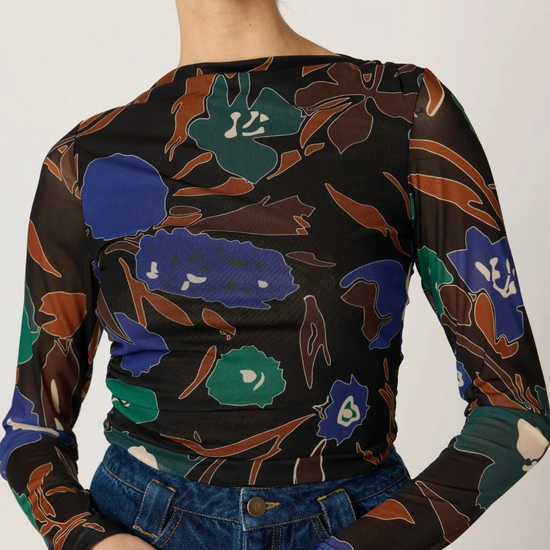 The Remy Top is back in Cleobella's fall collection, featuring an enchanting dark floral Mariposa print. Handcrafted in India from a breathable 88% nylon and 12% elastane blend, this best-seller combines comfort with timeless elegance. The refined high neckline and subtle shirring at the shoulders and waist create a flattering silhouette that adapts beautifully to every body type. A versatile essential for yoga, pilates, and everyday wear.