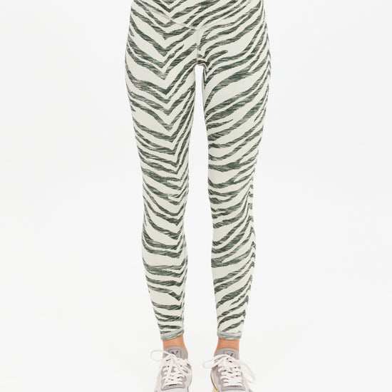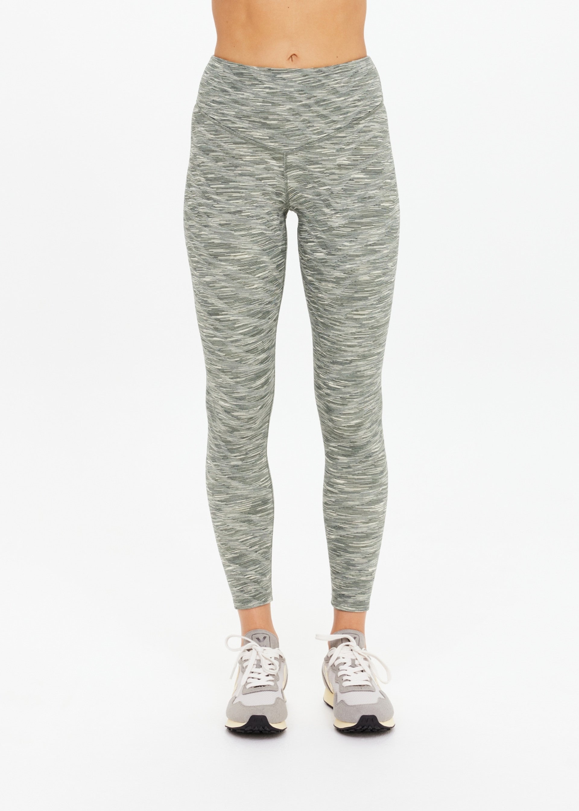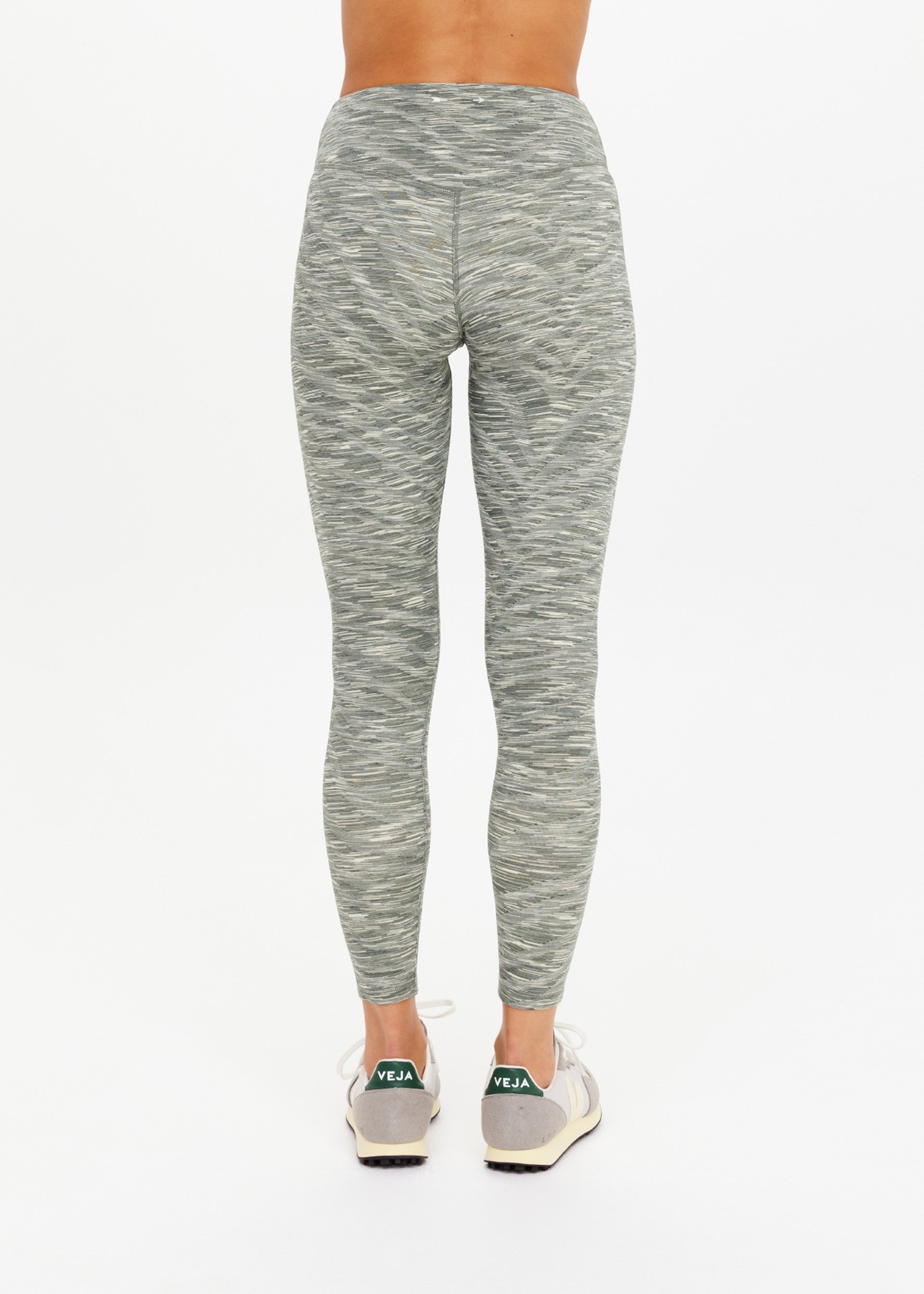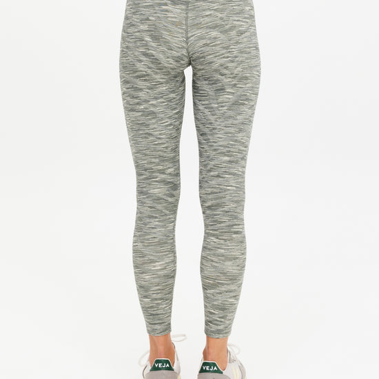 Elevate your activewear with our Reversible Legging, designed with a high-rise fit and a 25" leg length for versatile styling. Crafted from exclusive reversible recycled fabric, it features space dye green yarns on one side and a cream textured chevron pattern on the reverse. Moisture-wicking properties keep you dry and comfortable during movement, while the subtle embroidered arrow logo adds a refined finish. This legging offers double the style and sustainable performance for your dynamic lifestyle.
