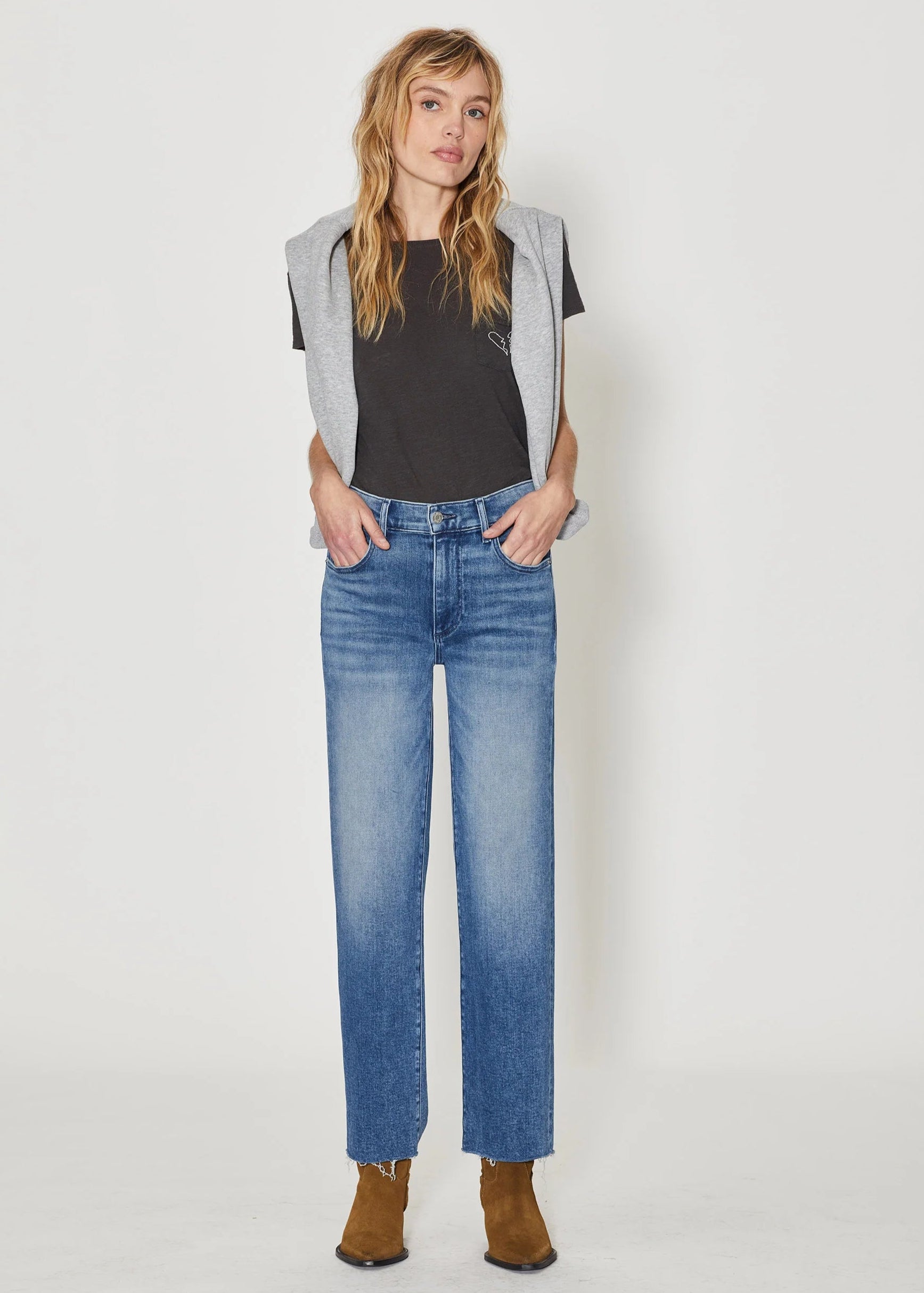 Step up your denim game with Sabine Straight Jeans. Crafted in Los Angeles with the perfect amount of stretch, these high-waisted jeans offer a comfortable and flattering fit. Their ankle length and medium wash make them a versatile addition to any wardrobe. Trust us, your closet will thank you!