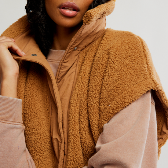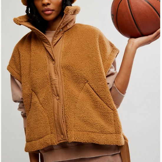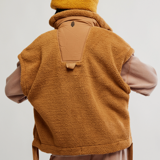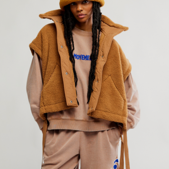 Stay warm and ready for adventure with the Scout It Out Vest. Its oversized, boxy fit and wide armholes make layering easy, while soft fleece and jersey-lined pockets keep your hands cozy. With button-front closure, a funnel neck, zippered pockets, and adjustable drawcord hem, this vest blends comfort and function. Perfect for chilly hikes, weekend camping, or just lounging around the studio, it’s your new go-to for outdoor fun.