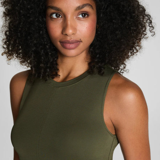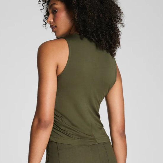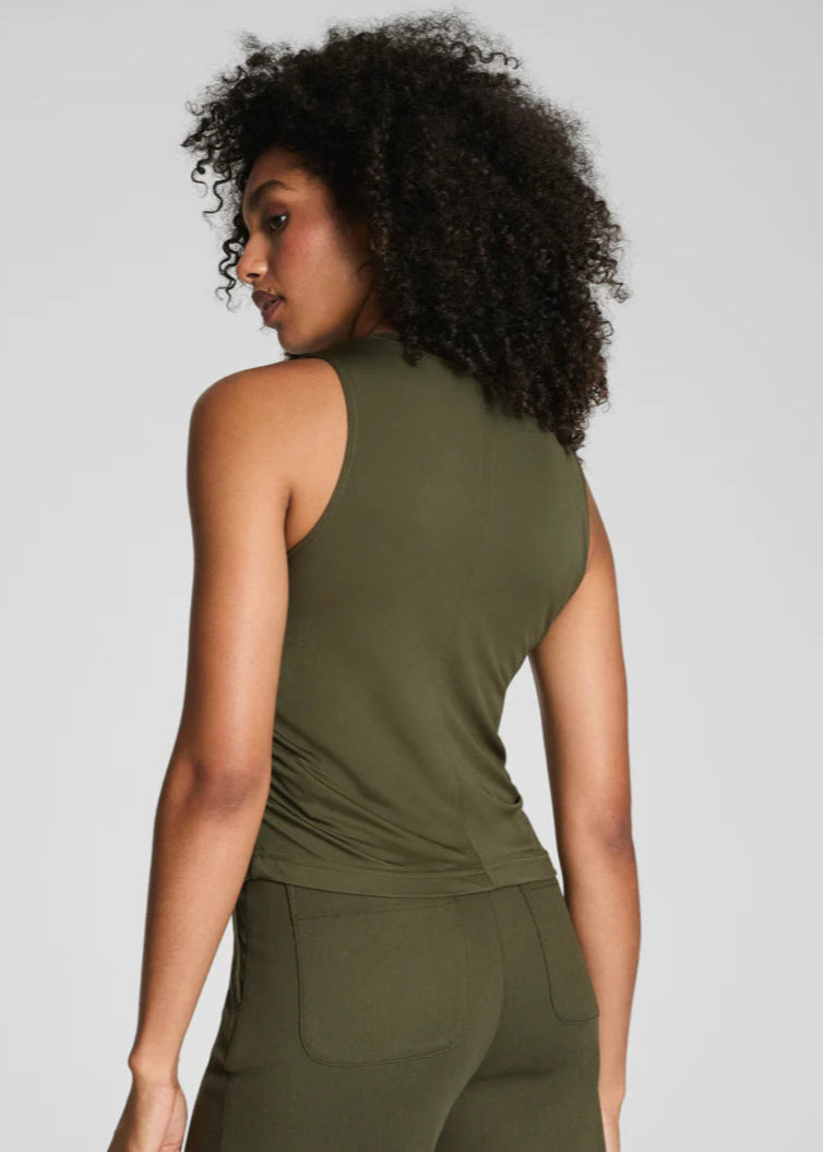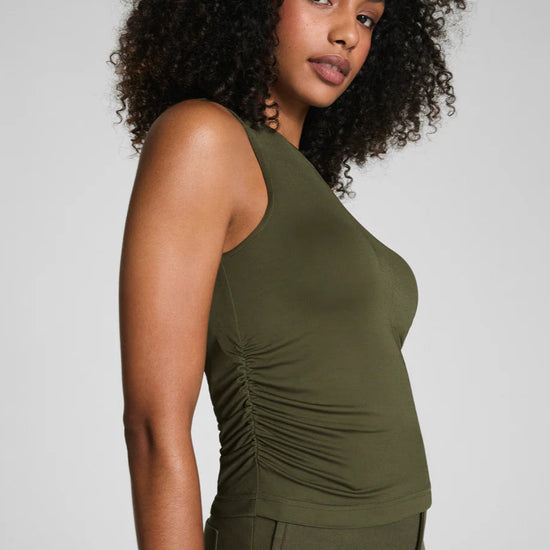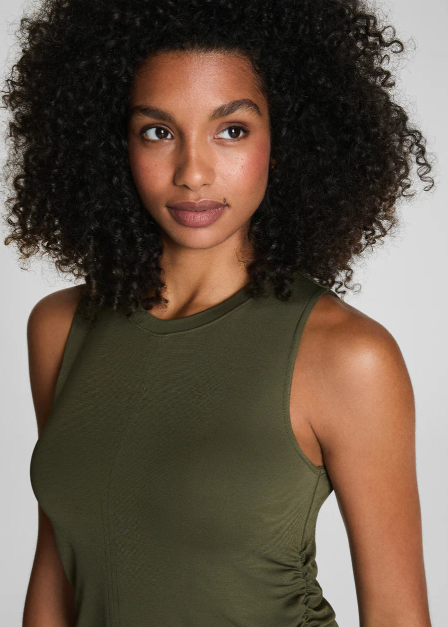 Crafted from premium 4-way stretch jersey, this ruched tank offers a smooth, body-skimming fit with full opacity for assured coverage. The high-neck design and hip-length cut create a modern silhouette, while strategic ruching and top stitching enhance the flattering shape. Designed with inclusive sizing, it ensures a perfect fit for every body. Its breathable fabric moves with you comfortably throughout the day, delivering a sleek, minimalist look that combines style and function with expert tailoring.