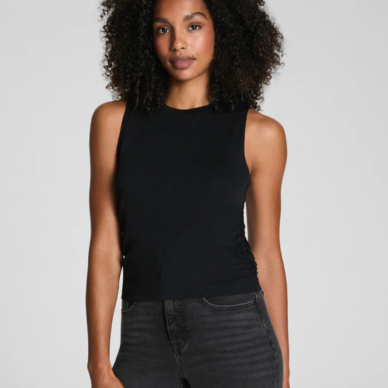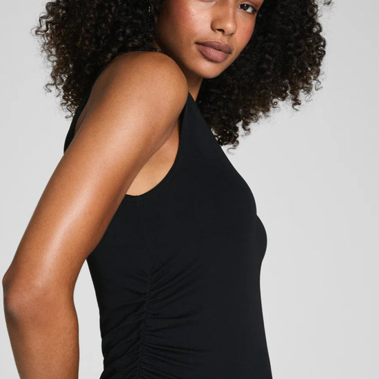 Crafted from premium 4-way stretch jersey fabric, the Sleek Jersey Ruched Tank offers a smooth, body-skimming fit with full opacity for reliable coverage. Its high-neck, hip-length design combined with strategic ruching and precise top stitching creates a modern, flattering silhouette. Engineered for comfort, the fabric provides moderate breathability and moves effortlessly with your body. Available in inclusive plus sizes, this minimalist tank delivers a polished, streamlined look suited for confident, all-day wear.