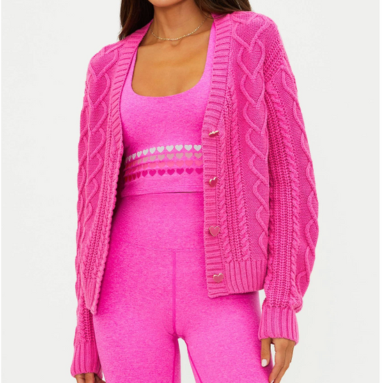 Wrap yourself in the Teagan Cardigan, a sophisticated layering piece that combines tactile luxury with everyday wearability. The chunky cable-knit construction delivers substantial warmth without bulk, while a flattering V-neck and ribbed cuffs create a polished silhouette. Charming heart-shaped buttons add a playful feminine detail that elevates the design. Crafted from a breathable blend, this cardigan transitions seamlessly across seasons, offering the perfect balance of softness and structure for year-round styling.