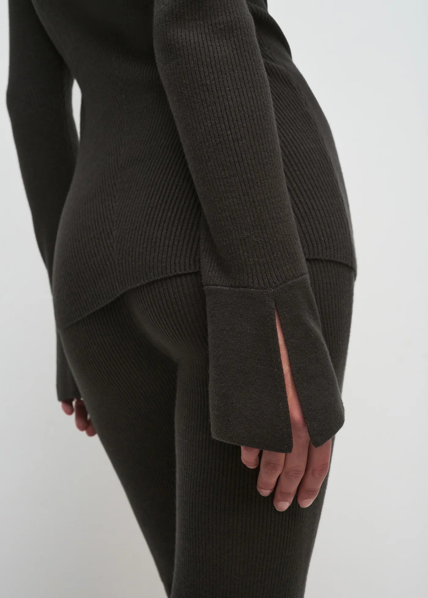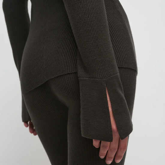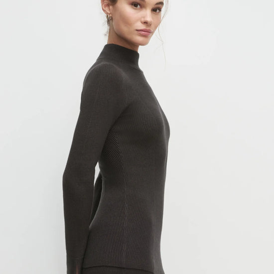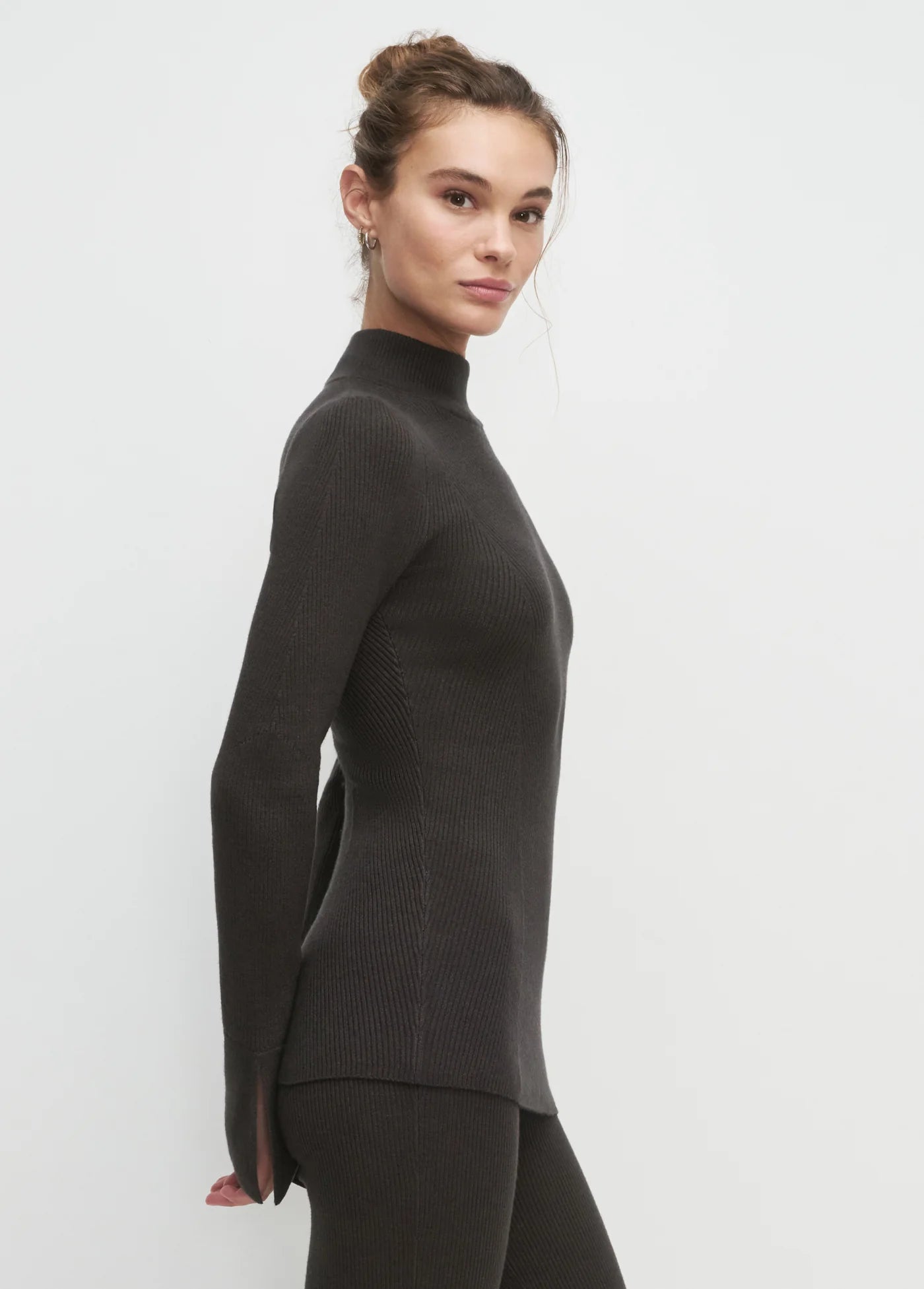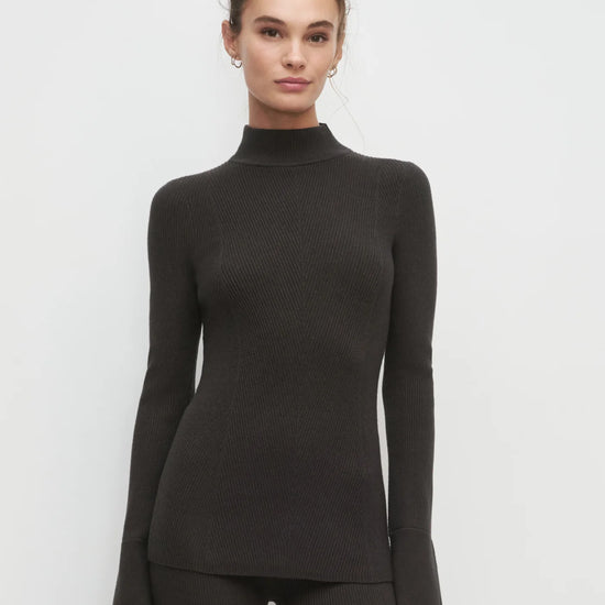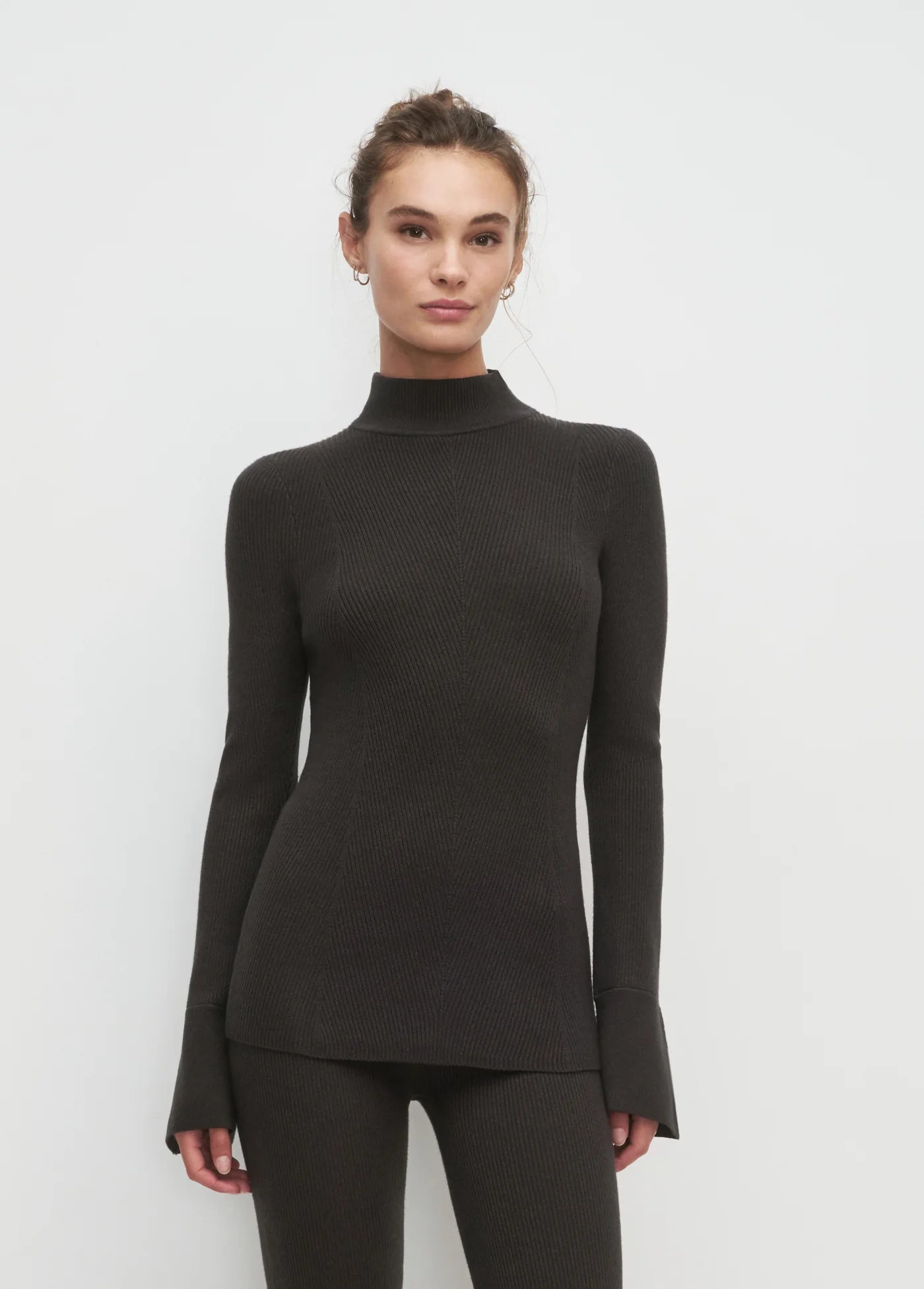 The Runway Top seamlessly transitions from high-fashion moments to everyday wear. Crafted from a luxuriously soft viscose blend, this piece features a refined rib-knit construction that adds subtle texture and dimension. The elevated high neckline pairs with a slim, tailored fit through the body, while dramatic bell-shaped cuffs deliver a sophisticated finishing touch. A versatile wardrobe essential that captures runway elegance with wearable comfort.