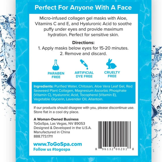 Micro-Infused Collagen Gel Masks with Marine Plant Collagen, Hyaluronic Acid, Aloe Vera, Vitamins C & E to de-puff and soothe tired under eyes!