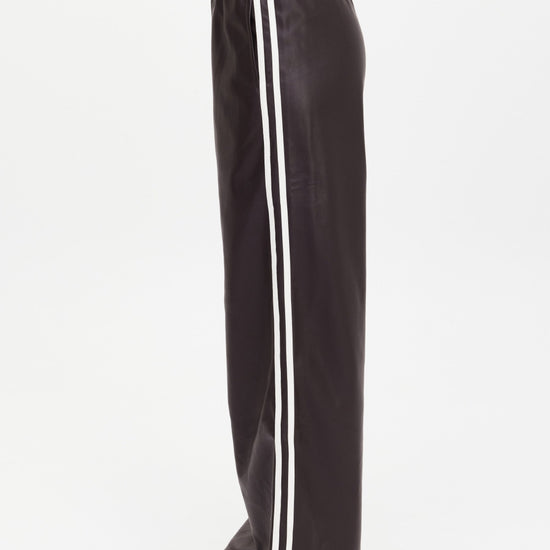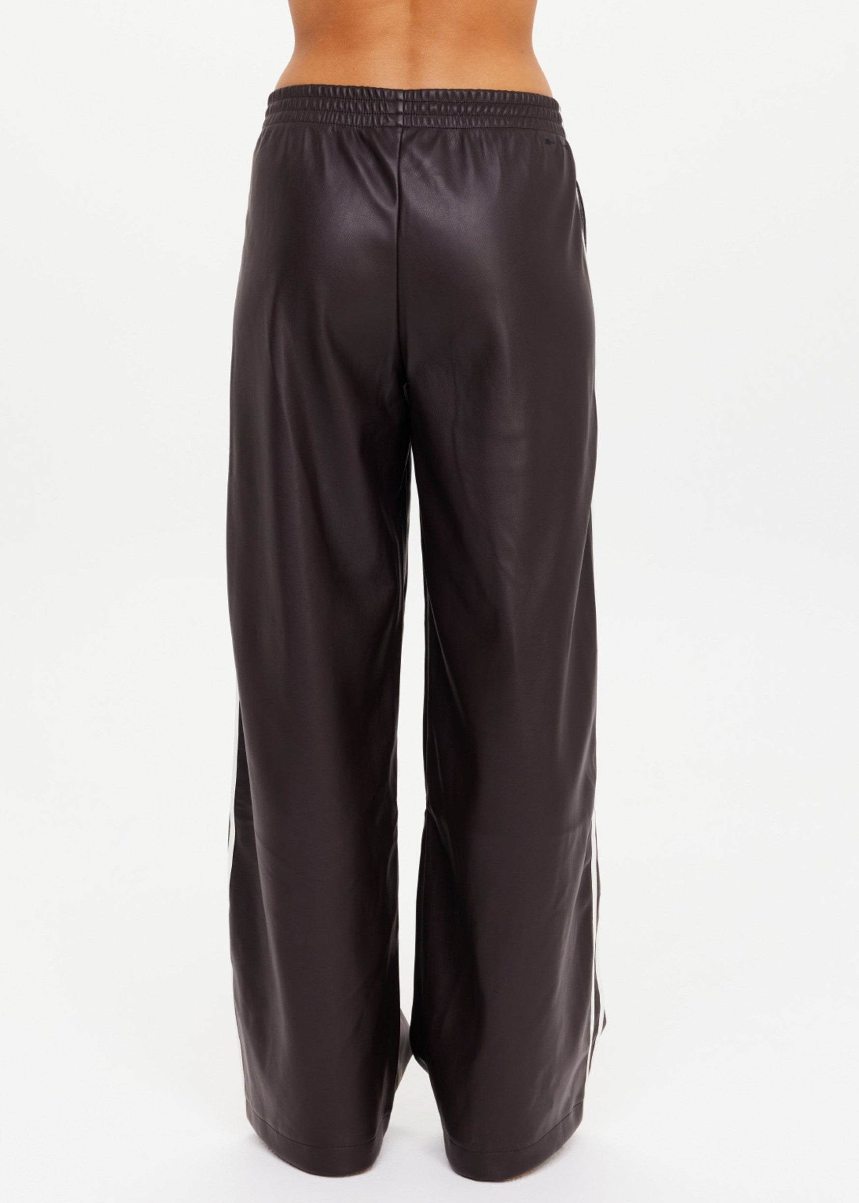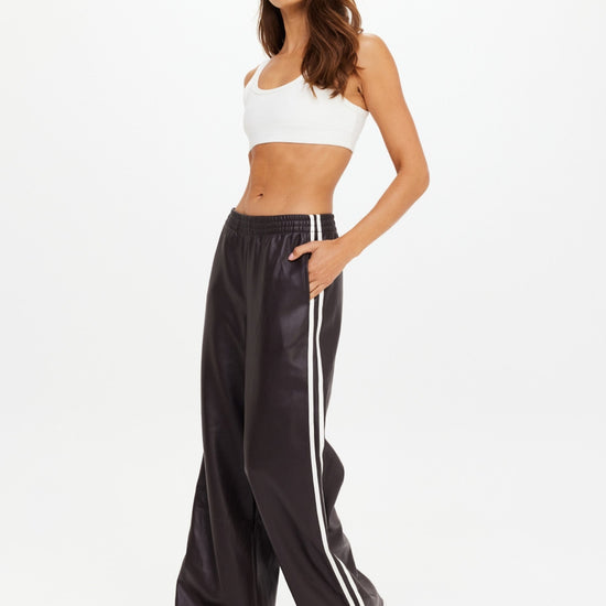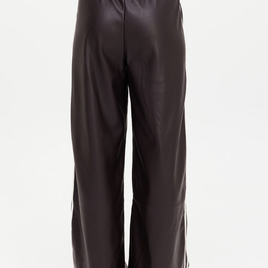 Elevate your style with the Vegan Leather Twilight Pant, crafted from recycled polyester for a sustainable touch. These wide-leg track pants in deep ebony feature a comfortable elastic waistband and striking contrast white sidebindings for a modern edge. Finished with an embroidered arrow logo at the back, they blend fashion and function effortlessly. Perfect for those who want to make a bold, eco-conscious statement every day.