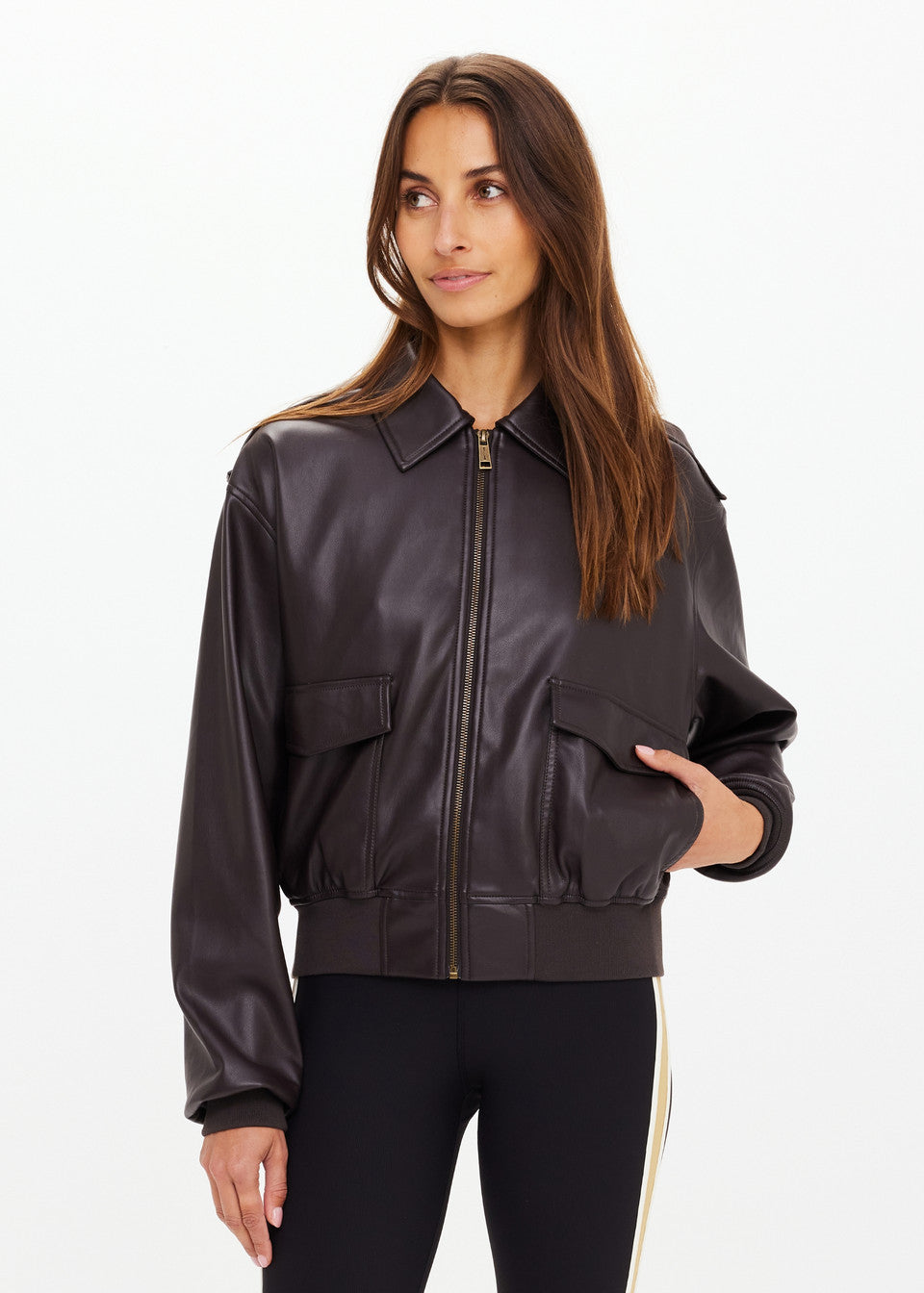 The Zariah Bomber Jacket combines contemporary design with enduring style. Crafted from supple vegan leather in deep ebony, this piece features a classic bomber silhouette with a structured collar and regular fit. Functional details include front patch pockets with flaps, side pocket openings, and ribbed hemband and cuffs for a refined finish. The fully lined construction ensures comfort, while an antique brass zipper with signature arrow pull adds a distinctive touch. A versatile layer that transitions effortlessly across seasons and occasions.